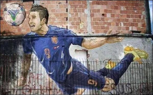 Le but du hollandais Van Persie face à l’Espagne a permis l’égalisation : cette tête plongeante, qu’on appelle en portugais peixinho du nom du joueur qui l’a rendu fameuse dans les années 60, restera dans les annales comme un des plus beaux buts du Mondial. La voici reproduite sur le mur d’une favela de Rio de Janeiro !